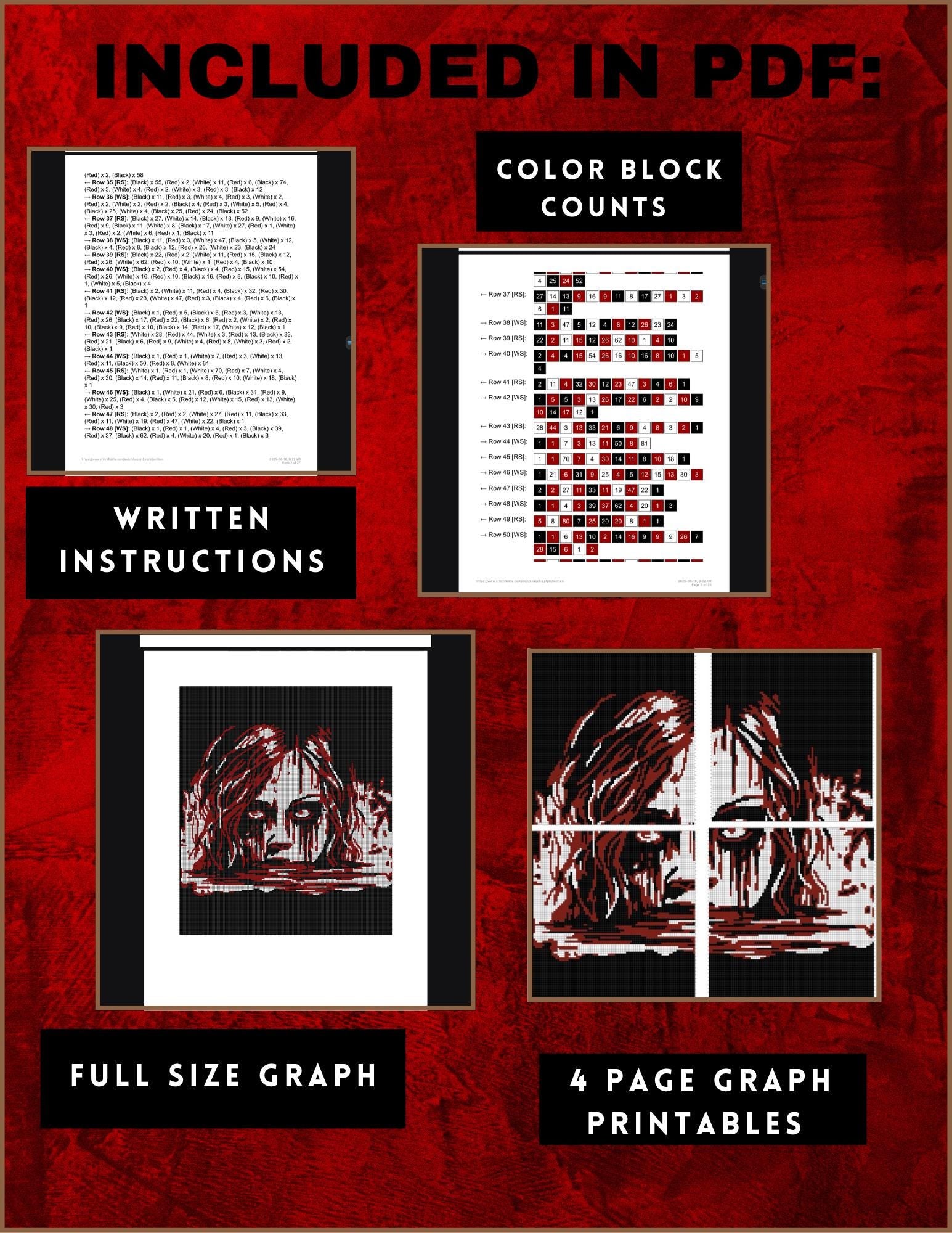 Unleash your creativity with our Creepy Horror Crochet Graphghan, a striking piece that captures the essence of chilling artistry. Designed for the experienced crocheter, this intricate pattern features a haunting image of a woman with blood dripping from her face, perfect for adding a spine-tingling touch to your home decor. Crafted using a 5 mm hook and single crochet techniques, this project requires a solid understanding of basic crochet terms, making it ideal for those looking to challenge their skills. Transform your crochet experience into a thrilling adventure and create a conversation starter that will leave everyone captivated.